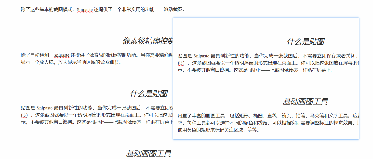除了这些基本的截图模式,Snipaste 还提供了一个非常实用的功能——滚动截图。